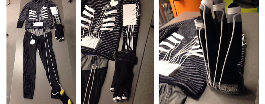 Since we envisioned our interface as a "second skin," we decided to implement a full body suit with embedded musical technology. To accomplish this, we used conductive paint, tape, thread, and a touch-sensitive microcontroller.